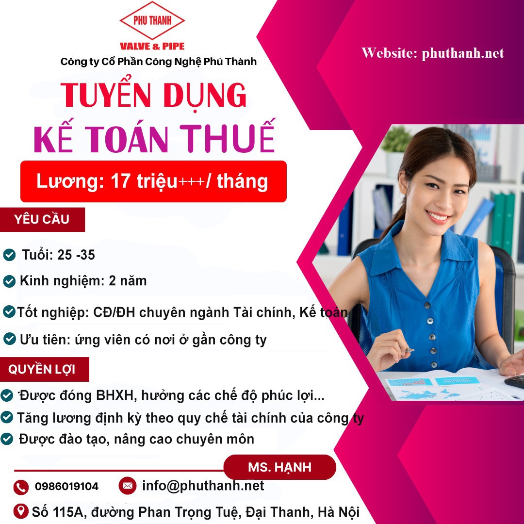 Công ty Phú Thành cần tuyển 01 nữ nhân viên Kế toán thuế. Thu nhập: 17 triệu trở lên/ tháng.