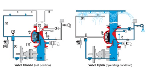 Khi hệ thống trong trạng thái nghỉ, khoang màng (phía thân dưới), do được nối với nguồn nước nên sẽ chứa đầy nước. Áp lực nước sẽ tác động lên xilanh, piston, tay quay, giúp khoá chặt cánh van và gioăng. Khi xảy ra cháy, đầu phun mở. Áp lực nước trong khoang màng giảm, làm giảm áp lực tác động lên xilanh, piston và tay quay. Hệ thống cung cấp nước mở cánh van và cung cấp nước cho đầu phun dập tắt đám cháy.